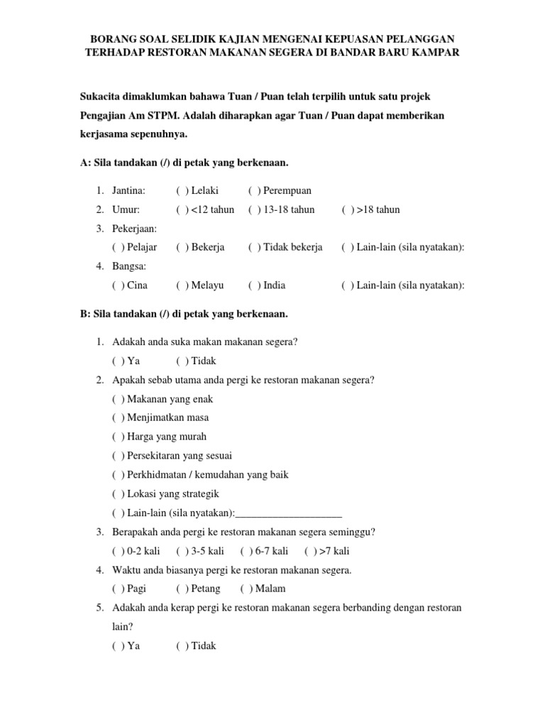 Doc Borang Soal Selidik Tahap Kepuasan Pelancong Terhadap Restoran Makanan Laut Di Waterfront Kota Kinabalu Nur Nabilah Academia Edu